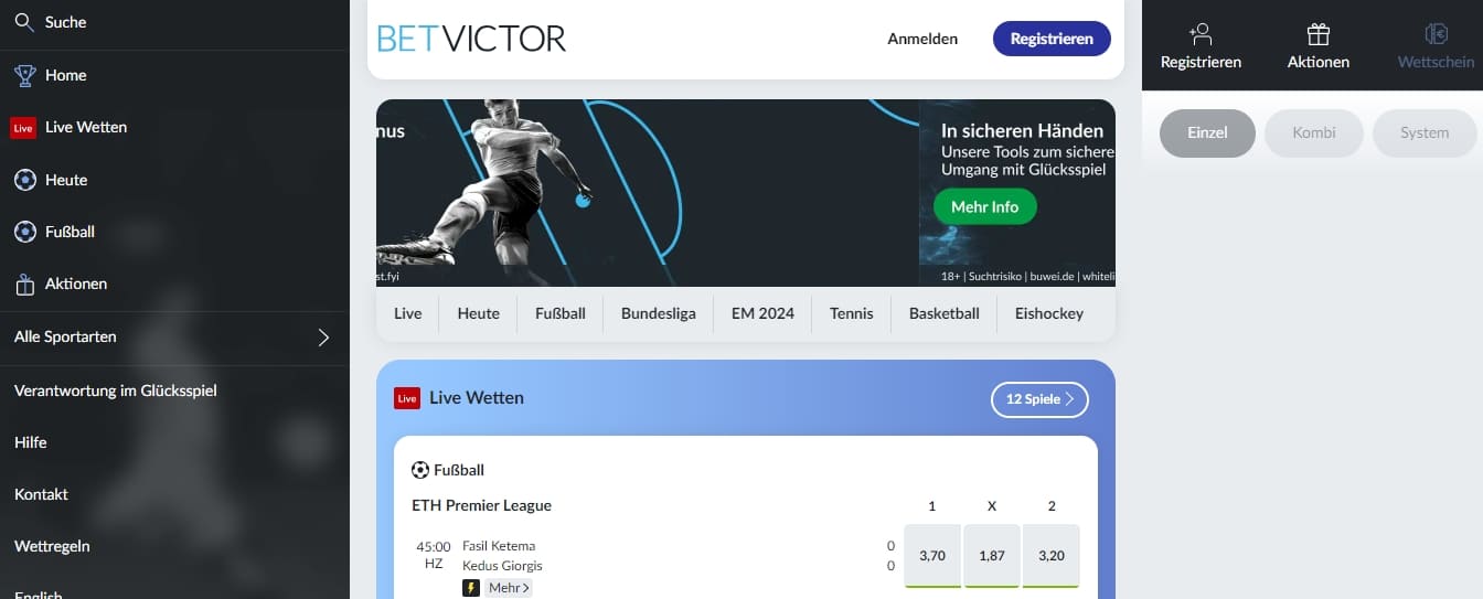 Was die Übersicht betrifft, ist die BetVictor Web App klar strukturiert und damit einfach zu bedienen. In der oberen fix verankerten Leiste kann sich der User registrieren/anmelden, darunter gibt es einen Werbebanner und anschließend Live-Quoten und die Top-Partien.
