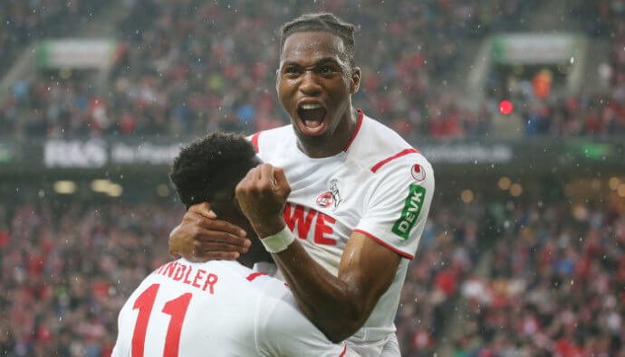 Die Kölner Schindler und Ehizibue bejubeln den Bigponit gegen den SC Paderborn (© firo Sportphoto / dpa Picture Alliance / picturedesk.com)