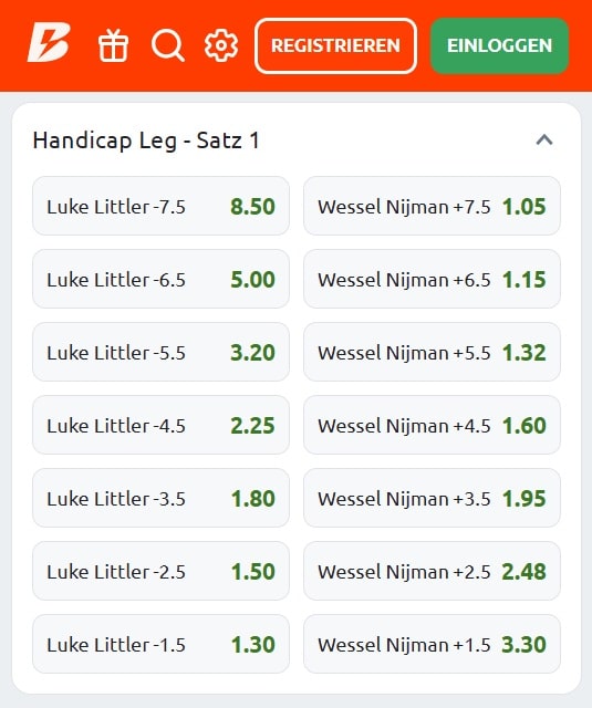 - 🎯 Viele Spezialmärkte – Handicap-, 180er-, Checkout- und Satzwetten.