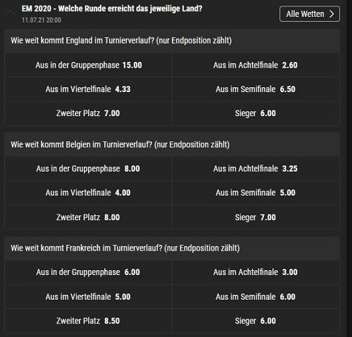 EM Finale Quoten Stand: 14.7.2024, 7:45 Uhr. Angaben ohne Gewähr. 18+ | AGB beachten.