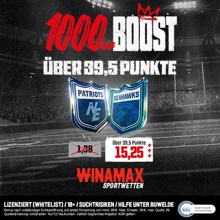 Mit einem attraktiven Quoten Boost Angebot wartet diese Woche Winamax zum Super Bowl auf. Neukunden erhalten einen 1000% Boost, den sie auf Patriots – Seahawks einsetzen können. Die erhöhte Quote gilt dabei für einen Tipp auf Über 39.5 Punkte im Spiel.