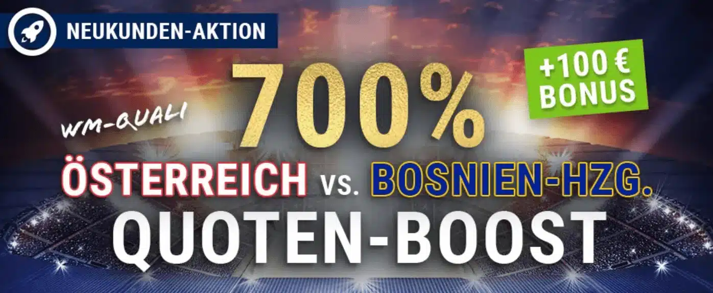 Mit einem attraktiven Quoten Boost Angebot wartet diese Woche Bet-at-home für Kunden aus Österreich auf. Neukunden dürfen sich für Österreich – Bosnien über einen 700% Boost freuen. Die erhöhte Quote gilt für eine 1×2 Prematch-Siegwette.