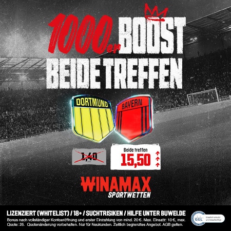 Mit einem attraktiven Quoten Boost Angebot wartet diese Woche Winamax auf. Neukunden erhalten einen 1000% Boost, den sie auf die Wette auf Dortmund – Bayern einsetzen können. Es gilt hier die Quote von 15.50, wenn beide Teams treffen.
