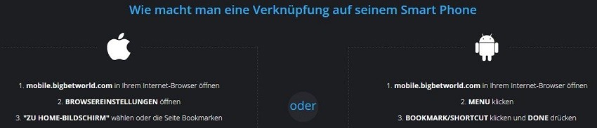 Dank der hervorragend in Szene gesetzten mobilen Wettseite lassen sich packende Quali-Wetten auch bequem vom Badesee oder Biergarten aus platzieren. Noch komfortabler wird die mobile Wettabgabe mit einer Verknüpfung, die über den Desktop des eigenen Smartphones oder Tablets direkt zur mobilen BigBetWorld-Wettseite führt.