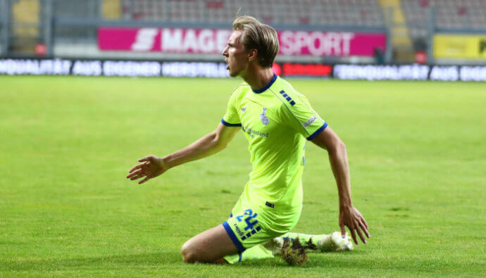 Duisburgs Vincent Vermeij bejubelt auf dem Betzenberg das richtungsweisende 2:1 (© imago images / Poolfoto)