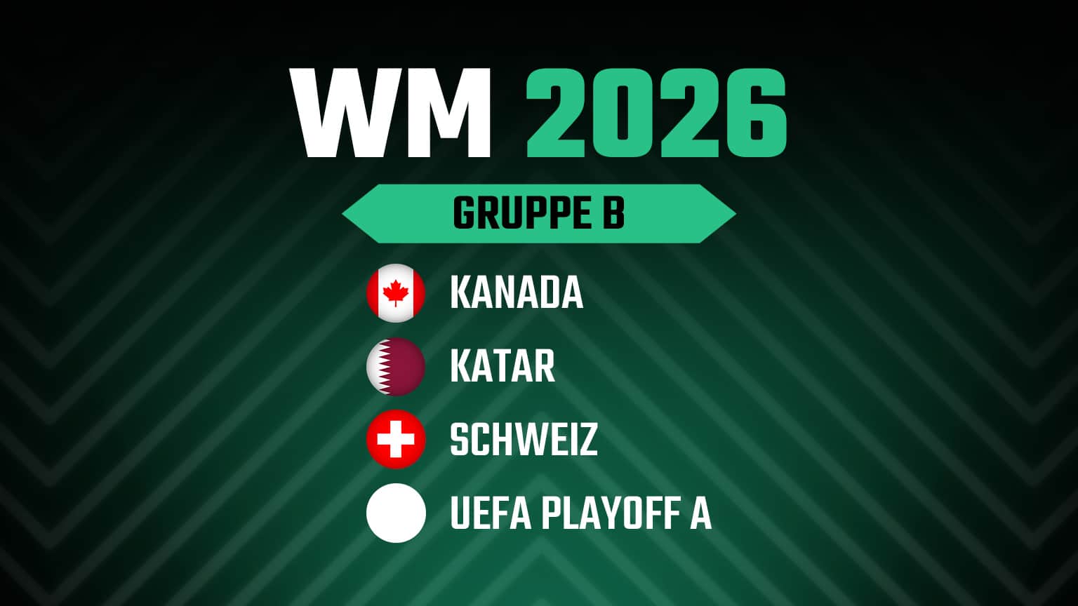 Die WM 2026 Gruppe B mit WM-Gastgeber Kanada, Schweiz, Katar und dem Sieger des UEFA-Playoff-Pfads A (Italien, Nordirland, Bosnien, Wales) im Überblick: Hier findest du den Spielplan mit allen Terminen, eine Übersicht der vier Teams sowie eine aktuelle Prognose zum Weiterkommen.