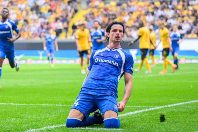 2. Liga Expertentipps heute: Nach zuletzt deutlich verbesserten Leistung wird das Elb-Clasico vom FCM (im Bild Jean Hugonet) mit reichlich Rückenwind bestritten (© dpa/Alamy Live News)